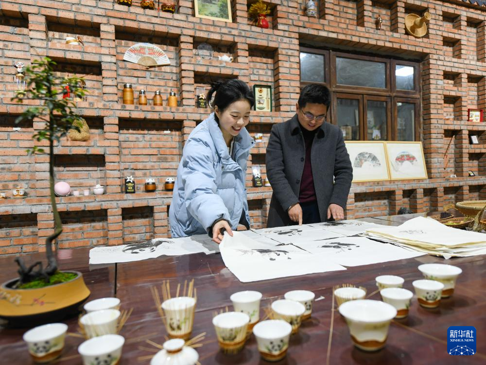 在崇州市朱利原乡非遗文化园,白静波和女儿白梓忆在查看编制中的“熊猫抱竹”盖碗茶杯细节(3月7日摄)。