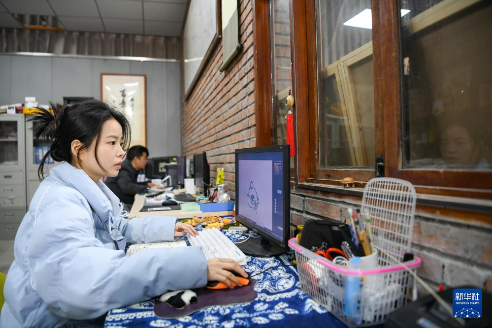 白梓忆(前)在电脑上设计完善熊猫文创形象细节(3月7日摄)。