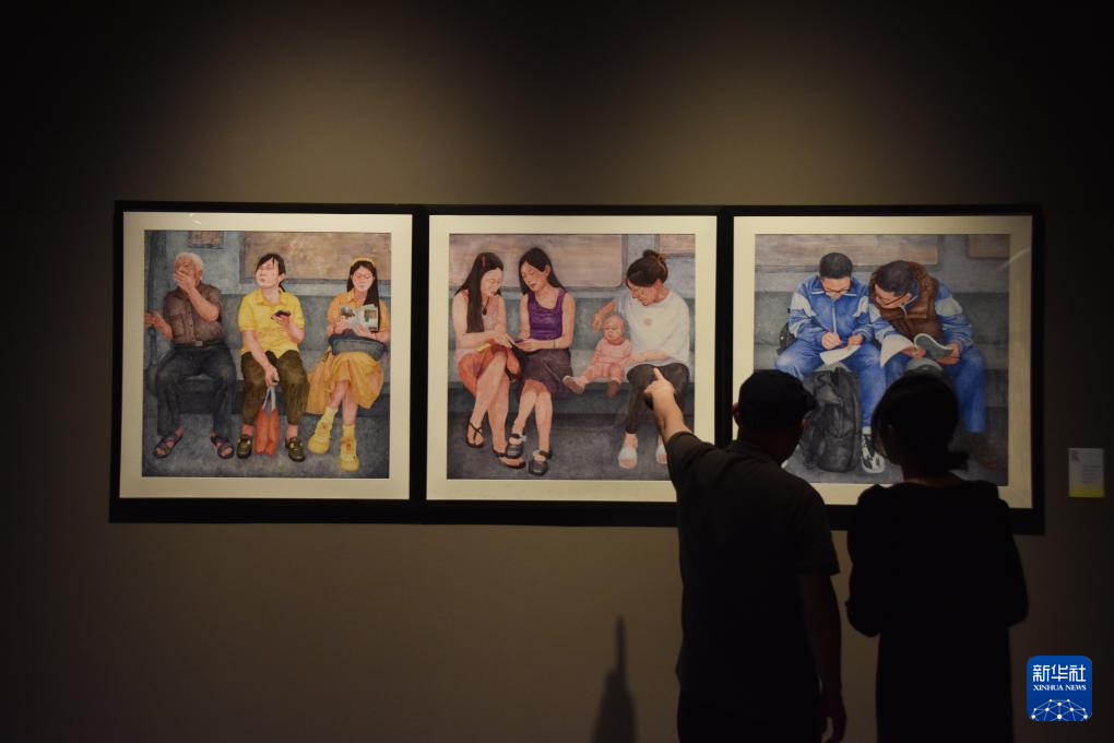 5月25日,两名参观者在第六届湖南高校毕业季美术作品展上讨论一组画作。