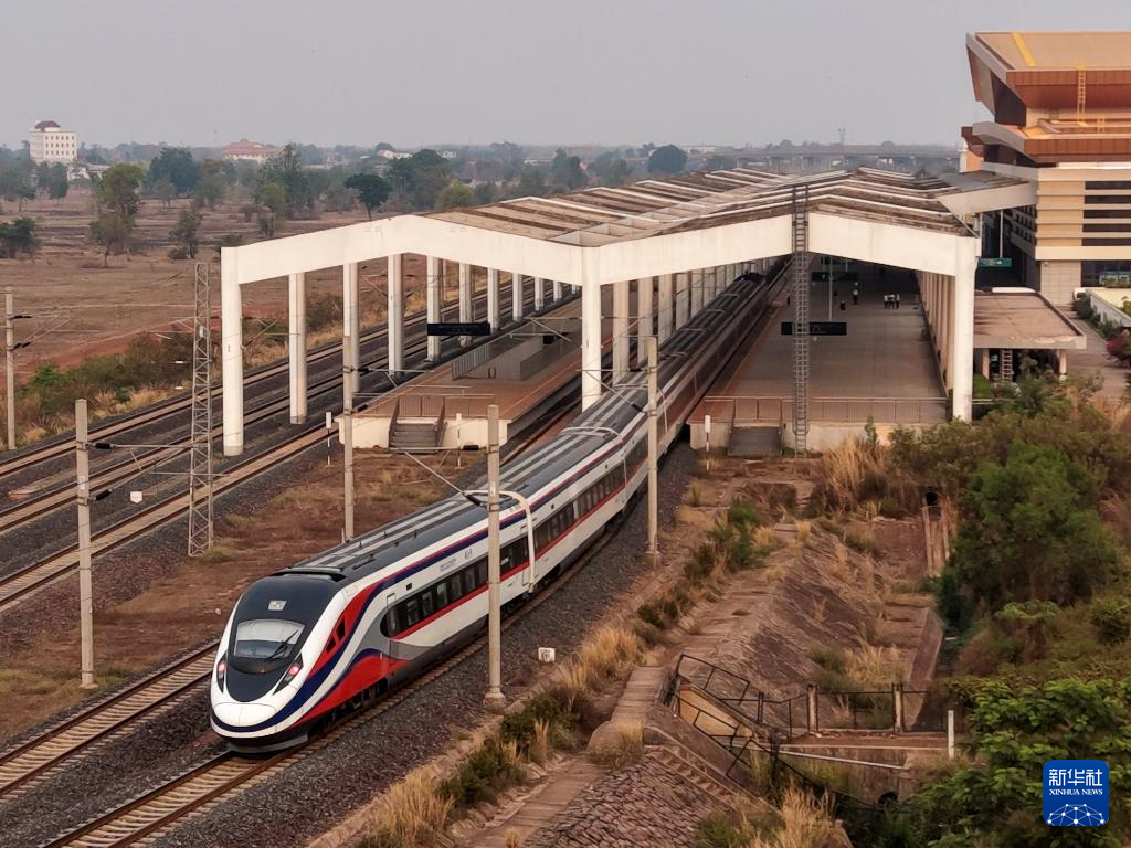 4月13日,一列从中国昆明始发的中老铁路国际旅客列车抵达老挝万象(无人机照片)。新华社发(夏宁钦摄)