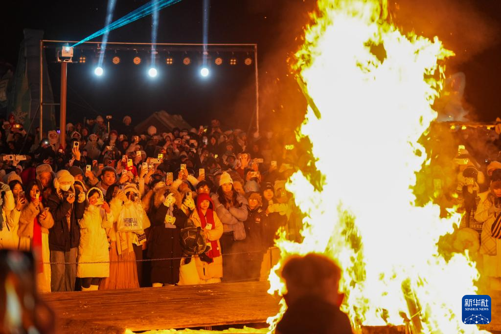 这是2月4日拍摄的新疆阿勒泰地区禾木村篝火晚会现场。