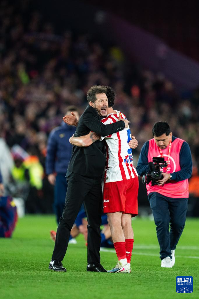3月3日,马德里竞技队主教练西蒙尼(前左)在赛后与球员卡多索(前右)庆祝晋级。