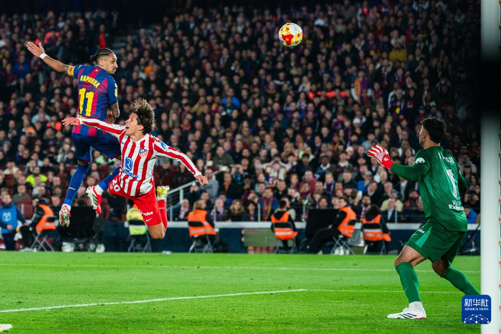 3月3日,巴塞罗那队球员拉菲尼亚(上左)在比赛中头球攻门。