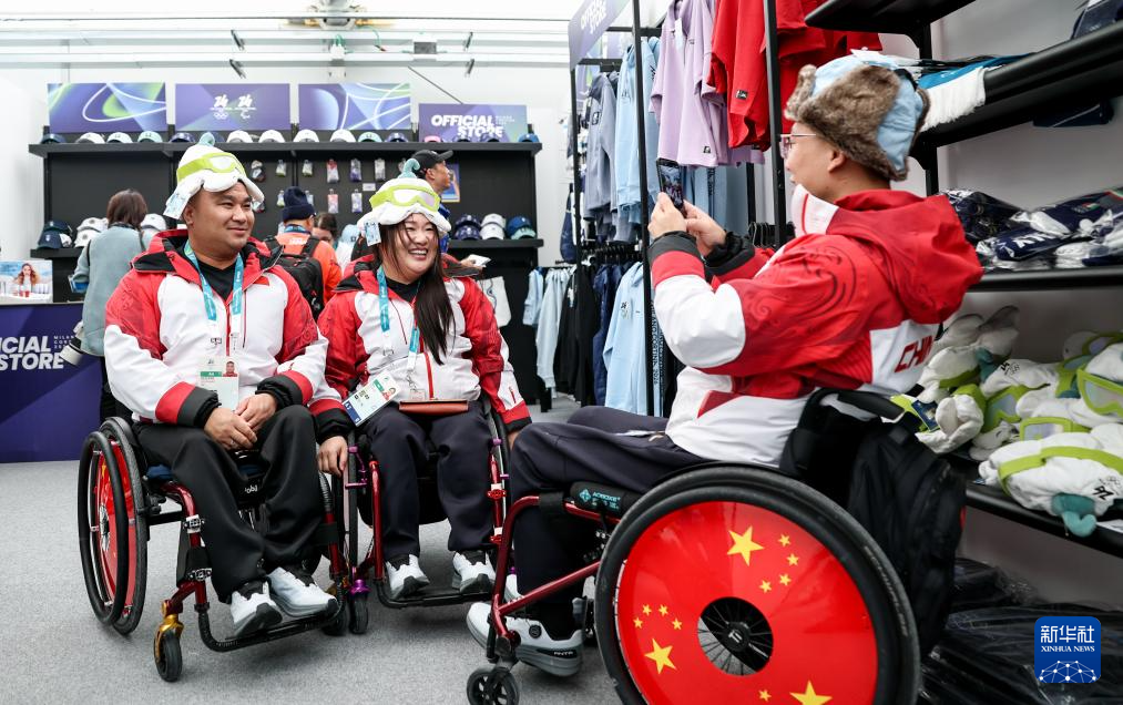 3月3日,中国残奥冰壶队选手陈建新(右)与队友李娜娜在残奥村内的纪念品商店选购。