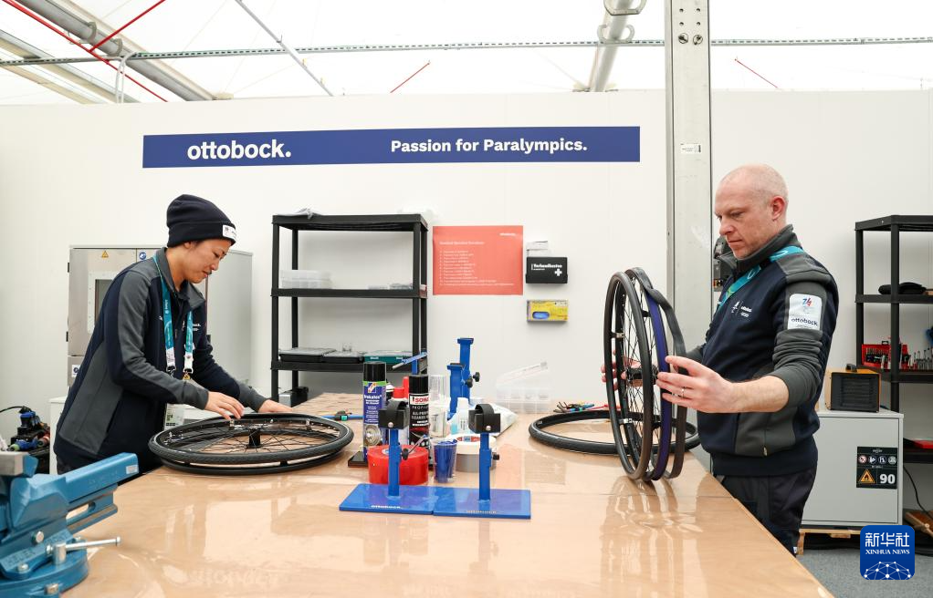 3月3日,工作人员在残奥村内的维修服务中心为运动员们维修轮椅。