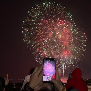 台胞彭欧雅在厦门生活已近30年,今年是她第一次和台湾的家人一同在厦门观看焰火晚会。现场观赏之余,她还通过视频连线,把绚烂的焰火分享给岛内的亲朋好友。