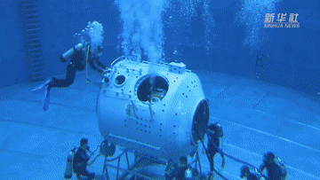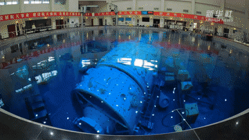 這里是航天員模擬失重水槽訓(xùn)練場。當(dāng)飛船繞地心運動時,會產(chǎn)生失重。航天員要在失重狀態(tài)下進行空間出艙活動和裝配維修等任務(wù)。實踐證明,模擬失重水槽訓(xùn)練是在地面上進行航天員艙外活動訓(xùn)練的最為有效方法。