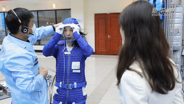 這里是離心機訓(xùn)練場。離心機由一個八米長的旋轉(zhuǎn)臂和飛行模擬座艙組成,它所產(chǎn)生的離心力通常用地心引力的倍數(shù)表示。例如2G等于兩倍地球引力,大概相當(dāng)于過山車從最高點急速俯沖到最低點時的壓迫感。普通人最多能承受4G的離心力,而像亞平一樣的航天員則要進行8G的過載訓(xùn)練。