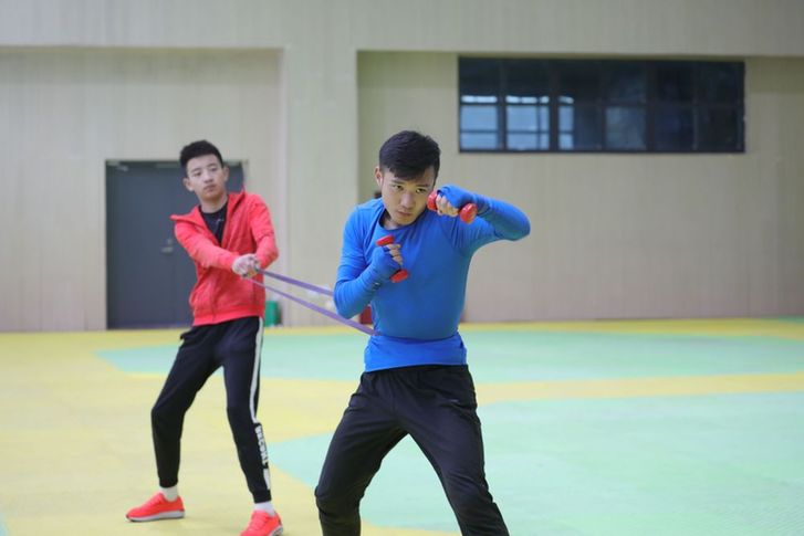 “通過啞鈴鍛煉肩部耐力,腳腕綁沙袋練習移動速度,用杠鈴加強出拳力量和爆發(fā)力,配合手靶全面練習。因為是從零開始,要想拿到成績,必須付出成倍的努力?!壁w佳偉說。
