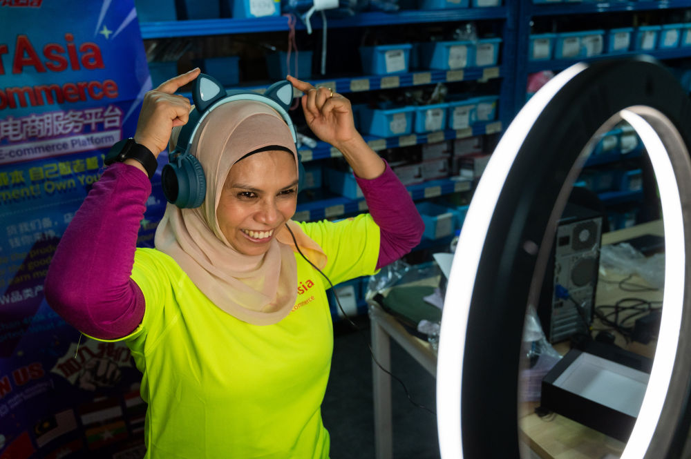 2021年4月14日,在馬來西亞雪蘭莪州的梳邦再也,佳克琳正在拍攝商品的介紹圖片。新華社記者 朱煒 攝