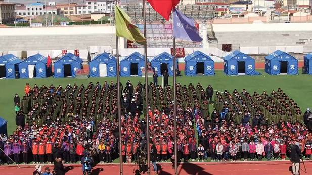 當(dāng)日,青海省果洛藏族自治州瑪多縣地震災(zāi)區(qū)中小學(xué)全面復(fù)課,來自瑪多縣民族寄宿制中學(xué)的八年級學(xué)生曲邁卓瑪與870多位同學(xué)一起,在帳篷學(xué)校迎來了復(fù)課。