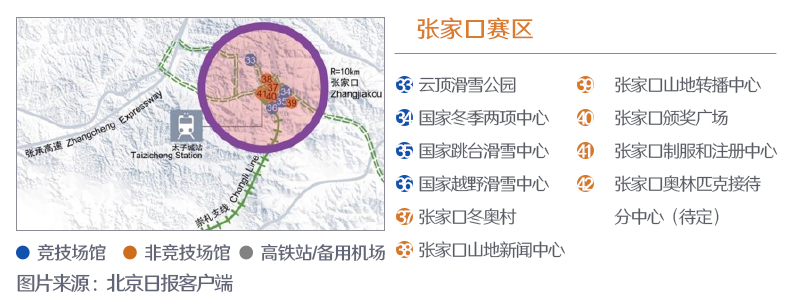 ??? 張家口賽區(qū)位于河北省張家口市崇禮區(qū),共有7個(gè)競(jìng)賽和非競(jìng)賽場(chǎng)館,其中4個(gè)為新建場(chǎng)館、1個(gè)為現(xiàn)有場(chǎng)館、2個(gè)為臨時(shí)場(chǎng)館。