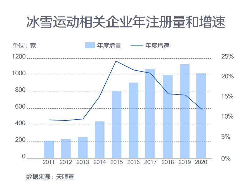 ??? 資料顯示,2015年7月31日,北京獲得2022年冬奧會(huì)舉辦權(quán)。同年,天眼查專業(yè)版數(shù)據(jù)顯示,冰雪運(yùn)動(dòng)相關(guān)企業(yè)年度注冊(cè)增速達(dá)到了歷史峰值(全部企業(yè)狀態(tài)),為24.4%。此后的幾年,冰雪運(yùn)動(dòng)相關(guān)企業(yè)總量仍呈上漲態(tài)勢(shì)。以工商登記為準(zhǔn),2020年我國共新增超過1,000家冰雪運(yùn)動(dòng)相關(guān)企業(yè)。