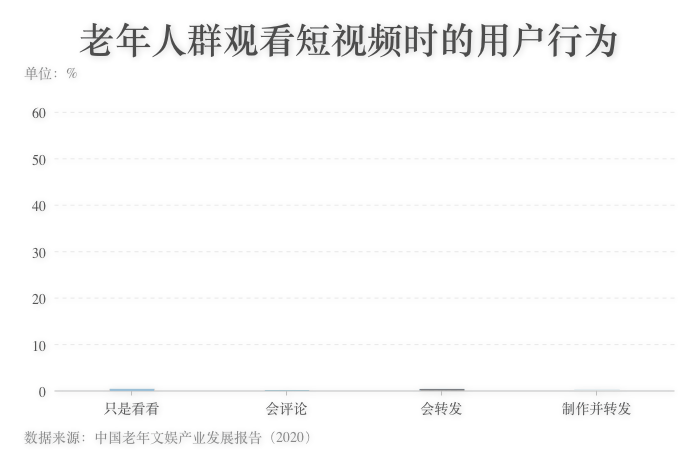 ???? ?總的來看,由于使用短視頻應(yīng)用的熟練程度、觀看短視頻的習(xí)慣等一些因素的影響,老年人群觀看短視頻的互動較少,但較愛轉(zhuǎn)發(fā)。從所有年齡段的用戶互動來看,82.8%的用戶有過不同形式的短視頻互動。其中,63.8%的用戶會轉(zhuǎn)發(fā)分享,65.5%的用戶會點(diǎn)贊、評論、收藏,不參與互動的用戶僅占13.2%。參與轉(zhuǎn)發(fā)分享的短視頻用戶當(dāng)中,20~39歲人群是主力軍,占比近60%,不參與互動的多為40歲以上的用戶。來自60加研究院的統(tǒng)計結(jié)果顯示,在參與互動的老年用戶中,會轉(zhuǎn)發(fā)的用戶占比達(dá)到53.8%,轉(zhuǎn)發(fā)是他們常有的互動行為。