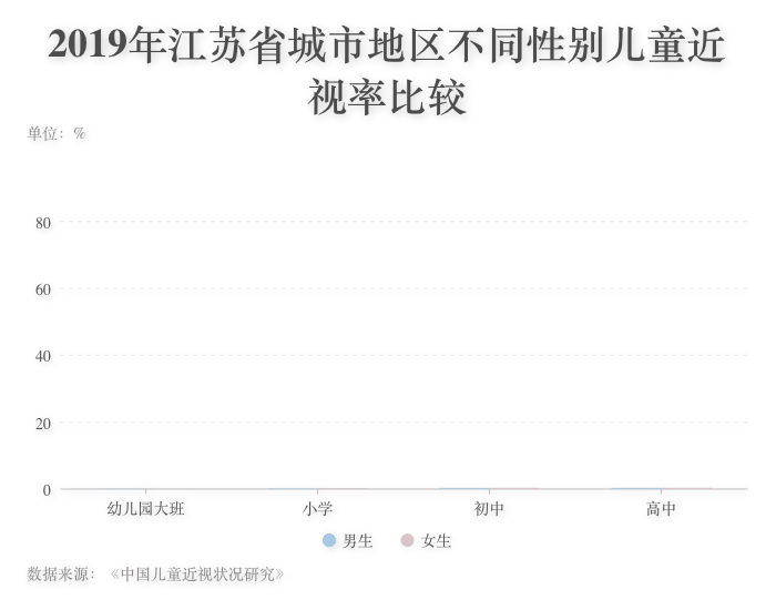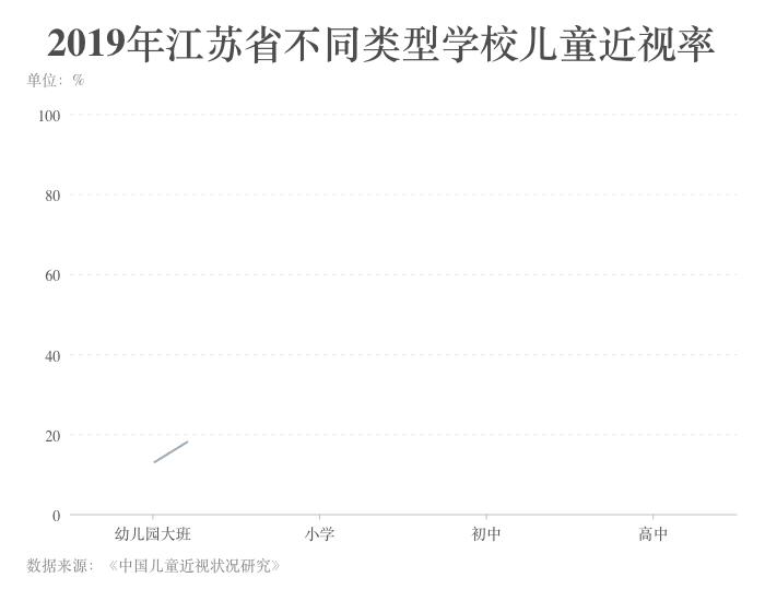 ????? 中國兒童近視率隨年齡的增長呈現(xiàn)上升趨勢。以江蘇省2019年的調(diào)查結(jié)果為例,該省幼兒園大班兒童近視率為12.8%,小學(xué)階段增長至38.5%,初中階段增長至80.2%,顯示出近視率在小學(xué)和初中階段增長速度較快,說明低年齡階段是近視防控的重點(diǎn)階段。
