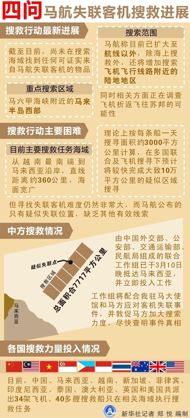 ????目前,中國(guó)、馬來(lái)西亞、越南、新加坡、菲律賓、印度尼西亞、泰國(guó)、澳大利亞、英國(guó)和美國(guó)共派出34架飛機(jī)、40多艘搜救船只在相關(guān)海域執(zhí)行搜救任務(wù)。