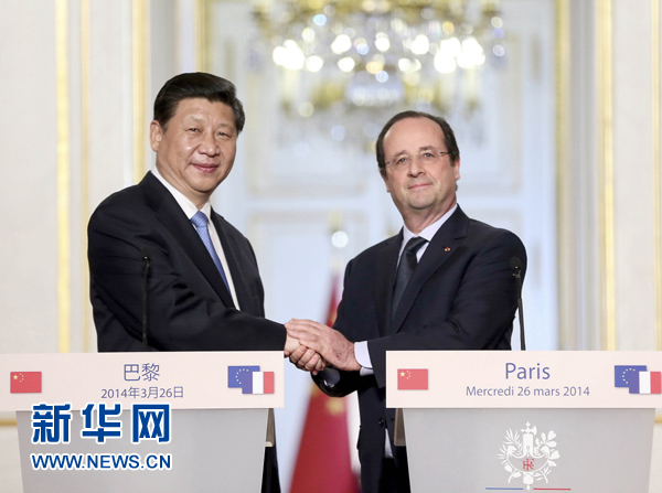 ????兩國元首還共同會見了記者。習(xí)近平表示,50年前,中法兩國沖破層層阻隔,實(shí)現(xiàn)歷史性握手,在國際關(guān)系史和東西方交流史上寫下濃墨重彩的一筆。這一歷史性事件體現(xiàn)出的互尊互信、平等相待、開放包容、互利共贏精神,至今仍具有重要時代意義。我同奧朗德總統(tǒng)共同規(guī)劃了兩國關(guān)系發(fā)展的方向和重點(diǎn),決定將發(fā)展中法關(guān)系作為各自外交優(yōu)先取向。我們要攜手合作,共同開創(chuàng)緊密持久的中法全面戰(zhàn)略伙伴關(guān)系新時代,繼續(xù)引領(lǐng)中歐關(guān)系和中國同西方國家關(guān)系發(fā)展。我對中法友好的未來發(fā)展更加充滿信心。