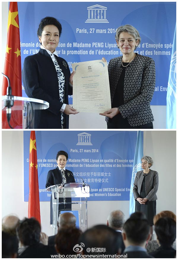 ????新華網(wǎng)北京3月27日電 據(jù)新華社“新國際”微博報道,習近平主席夫人彭麗媛27日在巴黎聯(lián)合國教科文組織總部被授予“促進女童和婦女教育特使”榮譽稱號。從博科娃總干事手中接過證書后,彭麗媛說,這是一項崇高的事業(yè),我愿意盡我所能,幫助更多孩子,為更多姐妹爭取接受教育的權(quán)利。