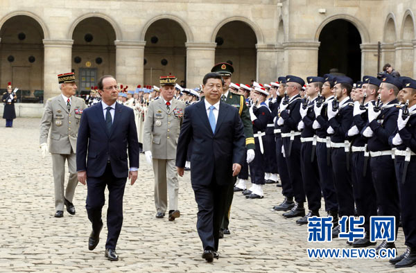 ??? 據(jù)新華社“新國際”微博3月27日?qǐng)?bào)道,法國總統(tǒng)奧朗德26日下午在巴黎榮軍院廣場(chǎng)舉行盛大儀式,歡迎中國國家主席習(xí)近平。打破常規(guī)在榮軍院舉行歡迎儀式,奧朗德總統(tǒng)一路陪同,146名騎兵左右護(hù)衛(wèi) ......隆重的禮儀,盡顯東道主的熱情和尊重。