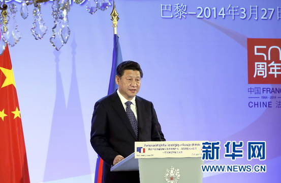 ????新華網(wǎng)巴黎3月27日電(記者李斌 劉華)中法建交50周年紀(jì)念大會(huì)27日在巴黎舉行。國(guó)家主席習(xí)近平和法國(guó)總統(tǒng)奧朗德共同出席并發(fā)表重要講話(huà)。習(xí)近平總結(jié)中法關(guān)系50年來(lái)的成功經(jīng)驗(yàn),闡述對(duì)兩國(guó)關(guān)系發(fā)展的政策主張,希望中法兩國(guó)人民在實(shí)現(xiàn)中國(guó)夢(mèng)和法國(guó)夢(mèng)的過(guò)程中相互理解、相互幫助,共同實(shí)現(xiàn)“中法夢(mèng)”。