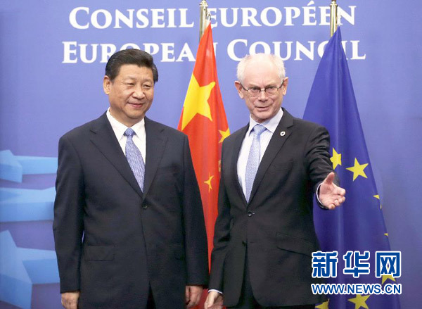 ????新華網(wǎng)布魯塞爾3月31日電(記者 魏建華 錢彤)國(guó)家主席習(xí)近平31日在布魯塞爾同歐洲理事會(huì)主席范龍佩舉行會(huì)談。雙方就新形勢(shì)下深化中歐全面戰(zhàn)略伙伴關(guān)系廣泛深入交換意見(jiàn),達(dá)成重要共識(shí)。習(xí)近平強(qiáng)調(diào),要從戰(zhàn)略高度看待中歐關(guān)系,將中歐兩大力量、兩大市場(chǎng)、兩大文明結(jié)合起來(lái),共同打造中歐和平、增長(zhǎng)、改革、文明四大伙伴關(guān)系,為中歐合作注入新動(dòng)力,為世界發(fā)展繁榮作出更大貢獻(xiàn)。