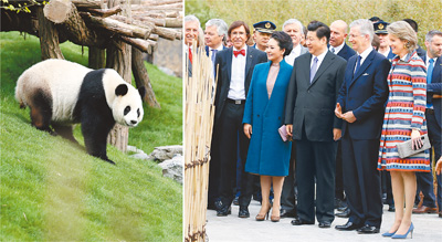 習近平和夫人彭麗媛抵達時,受到菲利普國王和瑪?shù)贍柕峦鹾?、比利時首相迪呂波熱情迎接。兩國領導人一同步入中國園。亭臺樓閣、雕梁畫棟、鳥語花香,這里宛如一幅恬靜祥和的中華寫意畫。兩國元首夫婦沿著回廊曲徑,穿過青翠竹林,前往大熊貓園。他們邊走邊談,回顧中比兩國友好交往。