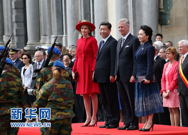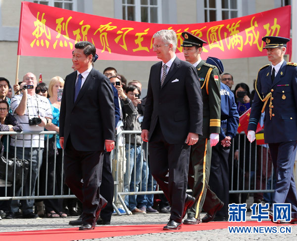 ??? 4月1日,國(guó)家主席習(xí)近平離開(kāi)比利時(shí)布魯日市啟程回國(guó)。離開(kāi)前,比利時(shí)國(guó)王菲利普在布魯日廣場(chǎng)為習(xí)近平舉行隆重歡送儀式。新華社記者龐興雷攝