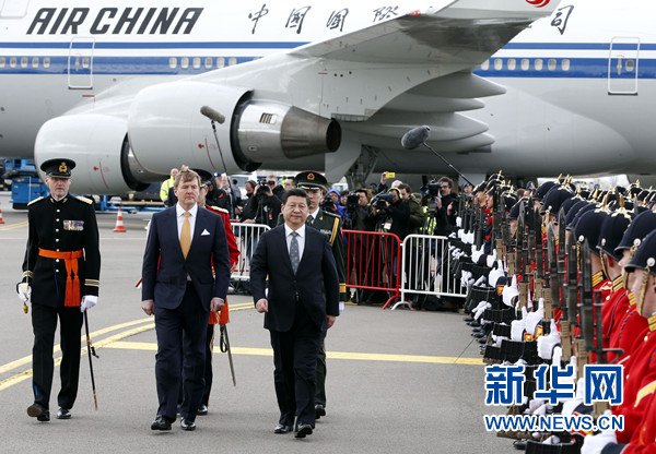 ??? 3月22日,國家主席習(xí)近平抵達(dá)阿姆斯特丹,應(yīng)荷蘭國王威廉-亞歷山大邀請,對荷蘭進(jìn)行國事訪問,開啟歐洲之旅。威廉-亞歷山大在機(jī)場為習(xí)近平舉行隆重歡迎儀式。這是習(xí)近平在威廉-亞歷山大陪同下檢閱儀仗隊(duì)。新華社記者 鞠鵬 攝