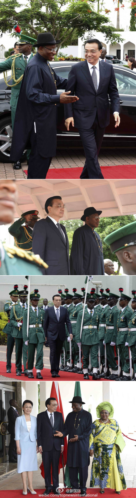 ??? 新華網(wǎng)北京5月7日電? 據(jù)新華社“新國(guó)際”微博報(bào)道,當(dāng)?shù)貢r(shí)間7日上午,尼日利亞總統(tǒng)喬納森在總統(tǒng)府為李克強(qiáng)總理舉行隆重歡迎儀式,現(xiàn)場(chǎng)鳴響禮炮,軍樂隊(duì)奏兩國(guó)國(guó)歌,李克強(qiáng)檢閱了儀仗隊(duì)。
