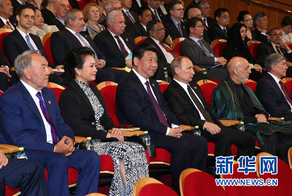 ??? 5月20日,國家主席習(xí)近平在上海國際會(huì)議中心舉行宴會(huì),代表中國政府和人民,歡迎前來出席亞洲相互協(xié)作與信任措施會(huì)議第四次峰會(huì)的各國貴賓。歡迎宴會(huì)后,“團(tuán)結(jié)和諧的亞洲-攜手向明天”-亞洲相互協(xié)作與信任措施會(huì)議第四次峰會(huì)文藝晚會(huì)在上海大劇院舉行。這是習(xí)近平和彭麗媛同與會(huì)各國貴賓共同觀看文藝晚會(huì)。新華社記者 龐興雷 攝