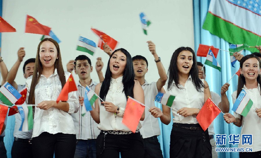 6月9日,學(xué)生代表在烏茲別克斯坦首都塔什干的烏世界語言大學(xué)禮堂表演節(jié)目。