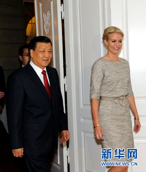 ??? 6月11日,正在丹麥進(jìn)行正式訪問(wèn)的中共中央政治局常委、中央書(shū)記處書(shū)記劉云山在哥本哈根會(huì)見(jiàn)丹麥?zhǔn)紫?、社民黨主席托寧-施密特。 新華社記者饒愛(ài)民 攝