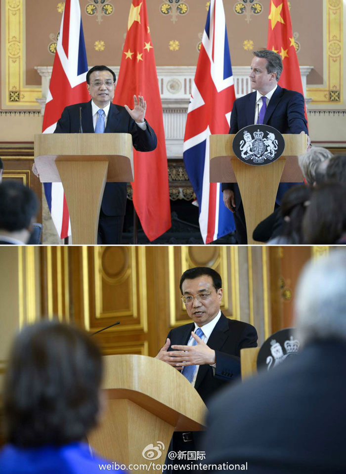 ??? 新華網(wǎng)北京6月18日電 據(jù)新華社“新國際”微博報(bào)道,17日,李克強(qiáng)與卡梅倫共見記者。李克強(qiáng)說,中英共同設(shè)立總額2億英鎊的科學(xué)基金,以加強(qiáng)聯(lián)合科學(xué)創(chuàng)新合作,第一個合作項(xiàng)目就是太空項(xiàng)目,這顯示了“我們合作的雄心”。未來5年中國將向英派遣1萬名公費(fèi)留學(xué)生,也歡迎英國向中國派遣更多留學(xué)生。