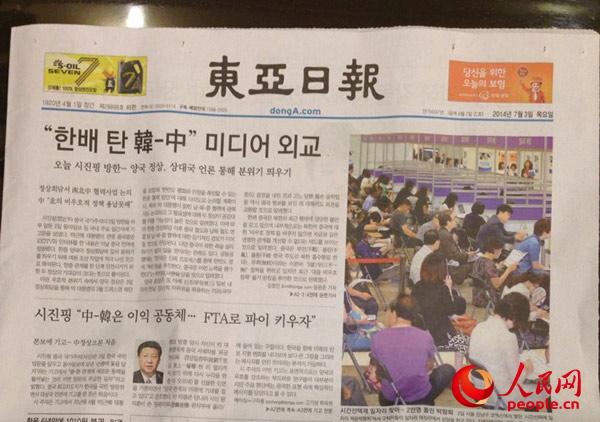 ??? 韓國《東亞日報》在頭版顯著位置刊發(fā)習(xí)近平主席署名文章《加快自貿(mào)區(qū)談判進程 做大利益蛋糕》金慧廷 攝