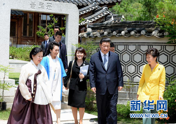 7月4日,國家主席習(xí)近平在首爾再次會(huì)見韓國總統(tǒng)樸槿惠。 新華社記者饒愛民 攝