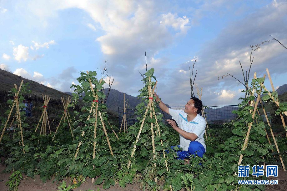 ????7月5日,烏茲別克斯坦安革連至琶布鐵路隧道項(xiàng)目安革連隧道進(jìn)口西口分部生活區(qū),杜潮停在菜地查看豆角長(zhǎng)勢(shì)。(沙達(dá)提 攝)