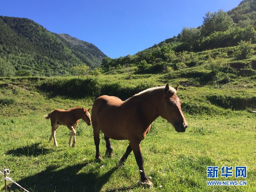 ????安道爾境內(nèi)山路邊一塊平坦的草地上,兩匹馬在悠閑地散步。(周喆 攝)