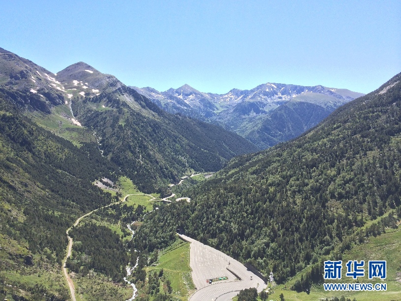 ????安道爾境內(nèi)連綿起伏的山脈和山間的公路。雖然是夏季,依然可以看到還有一些積雪。(周喆 攝)