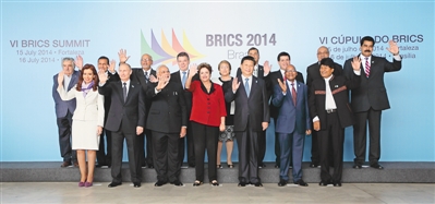 本報(bào)巴西利亞7月16日電?。ㄓ浾叨派袧伞⒍偅?月16日,金磚國(guó)家同南美國(guó)家領(lǐng)導(dǎo)人對(duì)話會(huì)在巴西利亞舉行。中國(guó)國(guó)家主席習(xí)近平、巴西總統(tǒng)羅塞夫、俄羅斯總統(tǒng)普京、印度總理莫迪、南非總統(tǒng)祖馬以及蘇里南總統(tǒng)鮑特塞、阿根廷總統(tǒng)克里斯蒂娜、玻利維亞總統(tǒng)莫拉萊斯、哥倫比亞總統(tǒng)桑托斯、智利總統(tǒng)巴切萊特、厄瓜多爾總統(tǒng)科雷亞、圭亞那總統(tǒng)拉莫塔爾、巴拉圭總統(tǒng)卡特斯、秘魯總統(tǒng)烏馬拉、烏拉圭總統(tǒng)穆希卡、委內(nèi)瑞拉總統(tǒng)馬杜羅等南美國(guó)家領(lǐng)導(dǎo)人共同出席。