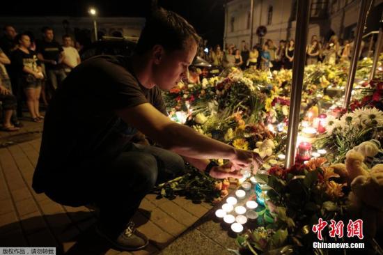 資料圖:7月17日,烏克蘭基輔,民眾們手持鮮花和蠟燭在荷蘭駐烏大使館前悼念馬航MH17事故遇難者。據(jù)稱,該架飛機上所載人數(shù)為298人,而此前報道稱飛機上共載295人。由于此次事件可能導致地面人員傷亡,總共的遇難人數(shù)將超過300人。