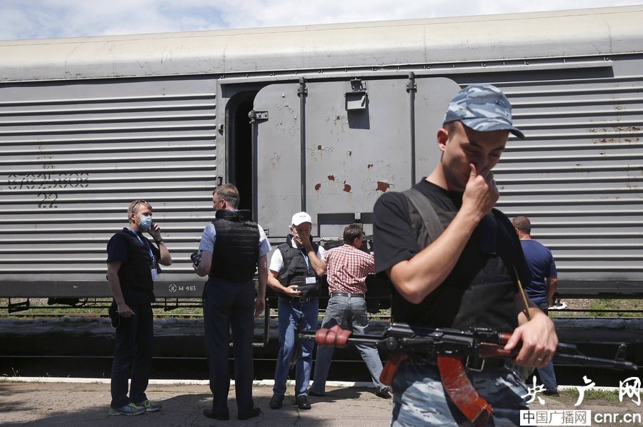 當(dāng)?shù)貢r(shí)間2014年7月20日,烏克蘭頓涅茨克Torez,馬航墜機(jī)遇難乘客遺體被裝上列車(chē)?yán)洳剀?chē)廂將被運(yùn)走。載有部分遺體的火車(chē)從距空難現(xiàn)場(chǎng)不遠(yuǎn)的烏克蘭托列茲市出發(fā),前往頓涅茨克市。火車(chē)離站前,身處空難現(xiàn)場(chǎng)的歐洲安全與合作組織(歐安組織)代表檢查了運(yùn)載遺體的5節(jié)冷藏車(chē)廂。
