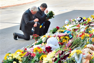 21日,基輔,烏克蘭總統(tǒng)波羅申科在荷蘭駐烏克蘭使館外敬獻(xiàn)鮮花。
