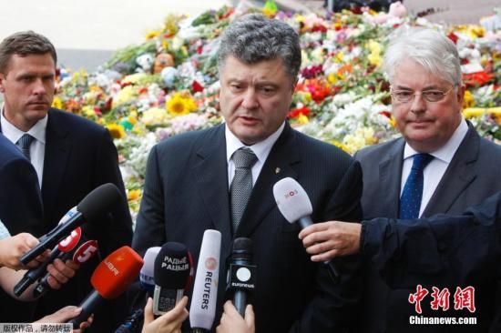 當(dāng)?shù)貢r間7月21日,烏克蘭基輔,烏克蘭總統(tǒng)波羅申科在荷蘭駐烏克蘭大使館外悼念馬航MH17遇難者。