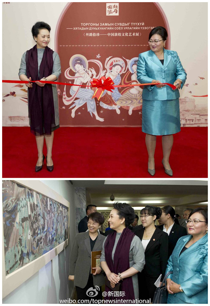 ???? 新華網(wǎng)北京8月22日電 據(jù)新華社“新國際”微博報道,習近平主席夫人彭麗媛和額勒貝格道爾吉總統(tǒng)夫人包勒爾瑪22日上午共同出席為慶祝中蒙建交65周年暨“中蒙友好交流年”舉行的中國文化周開幕式并剪彩,欣賞蒙古國藝術家的精彩演出,并參觀中國敦煌文化藝術展,觀賞臨摹的敦煌石窟壁畫、復制泥塑和樂器。