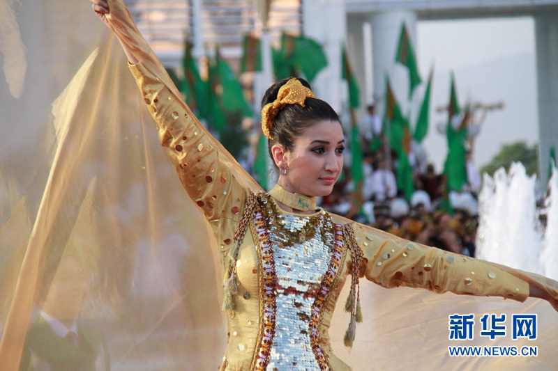 身著節(jié)日盛裝的土庫(kù)曼斯坦美女在跳舞? 記者 盧敬利攝