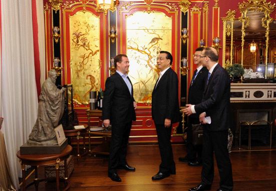 夕陽西下,秋意闌珊。梅德韋杰夫早早在官邸門口迎候克強(qiáng)總理,并請(qǐng)他來到金碧輝煌的“中國廳”用餐。