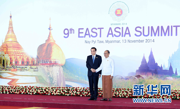 ??? 新華網(wǎng)內(nèi)比都11月13日電(記者陳二厚 桂濤)國務(wù)院總理李克強當(dāng)?shù)貢r間13日上午在緬甸內(nèi)比都出席第九屆東亞峰會。東盟十國領(lǐng)導(dǎo)人以及韓國總統(tǒng)樸槿惠、日本首相安倍晉三、美國總統(tǒng)奧巴馬、俄羅斯總理梅德韋杰夫、印度總理莫迪、澳大利亞總理阿博特、新西蘭總理約翰·基出席。緬甸總統(tǒng)吳登盛主持會議。