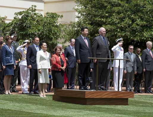 ??? 11月17日,澳大利亞總督科斯格羅夫在總督府草坪為習近平舉行隆重歡迎儀式。習近平和夫人彭麗媛抵達時,受到科斯格羅夫總督夫婦熱情迎接。新華社記者李學仁攝