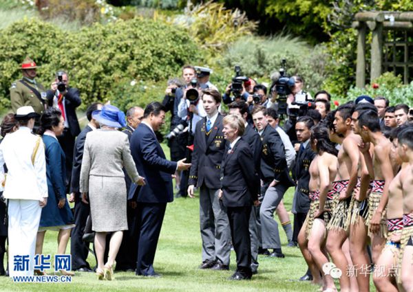 ????新西蘭的歡迎儀式頗具特色。習(xí)近平主席和夫人彭麗媛抵達(dá)時(shí),毛利族人排著整齊列隊(duì),表演挑戰(zhàn)儀式,以毛利族最古老的迎賓禮歡迎最尊貴的客人。