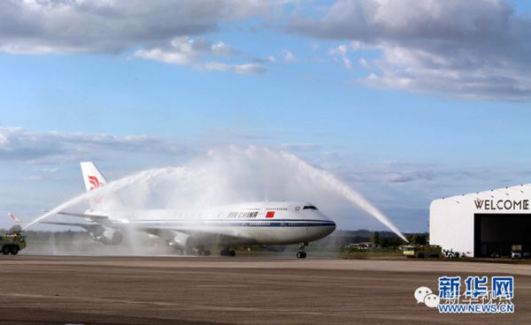 ???? ?11月21日,國(guó)家主席習(xí)近平抵達(dá)楠迪,開(kāi)始對(duì)斐濟(jì)進(jìn)行國(guó)事訪問(wèn)并將同太平洋建交島國(guó)領(lǐng)導(dǎo)人舉行會(huì)晤。圖為習(xí)近平乘坐的專(zhuān)機(jī)在楠迪國(guó)際機(jī)場(chǎng)跑道上滑行穿過(guò)“水門(mén)”,這是當(dāng)?shù)亟o予最尊貴客人的禮遇,表達(dá)為客人“洗塵”。 新華社記者 丁林 攝